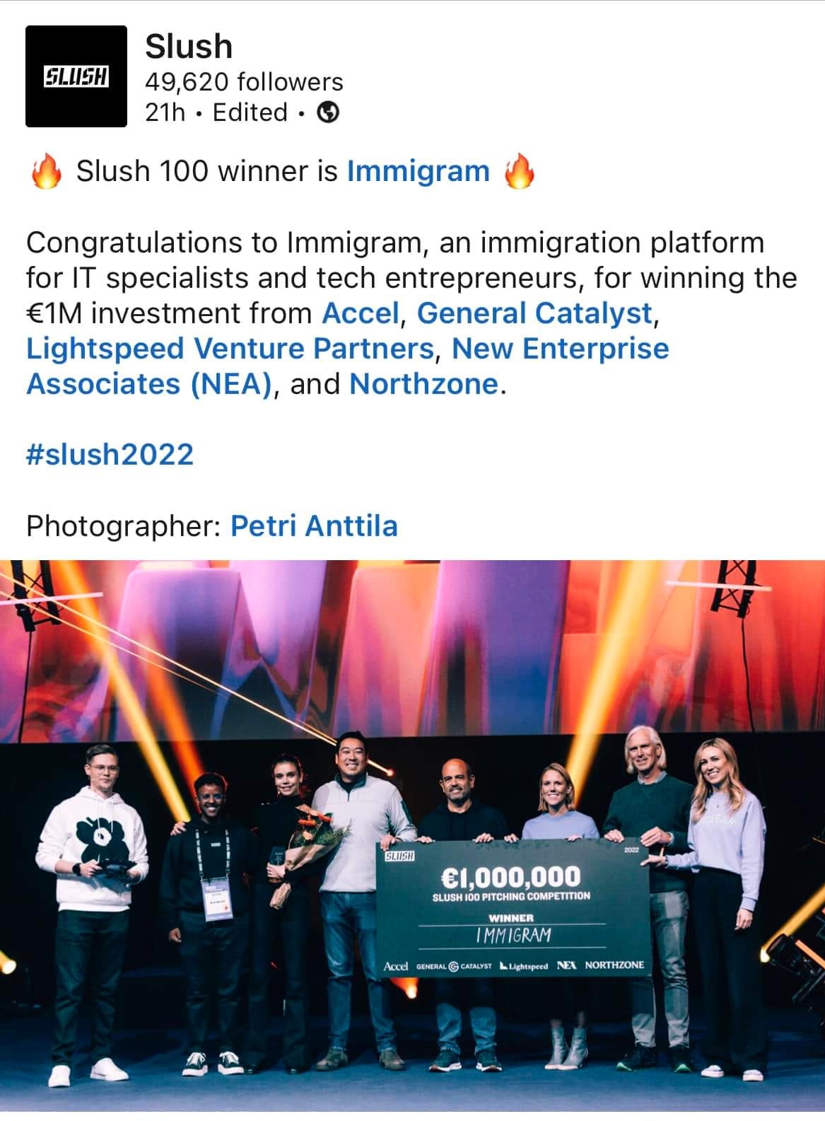 Web Russian-founded Immigram a SaaS platform that is guiding tech workers during their relocation journey to the UK won the Slush 100 Pitching Competition. Web Immigram team is building an immigrant-focused end-to-end global mobility platform helping streamline and automate immigration complexity thus enabling informed relocation. Перемогу анулювали але чому вона взагалі стала можлива.